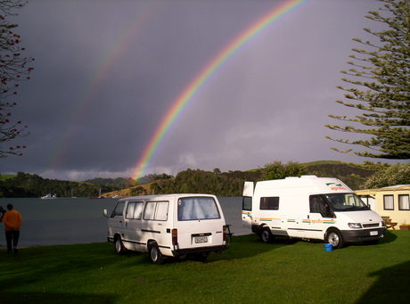 De eerste dag met de bus zijn we niet zo ver gegaan (tot aan Warkworth voor de mensen met de kaart) want de weg ernaar toe was behoorlijk spannend. Vooral voor mij, met niet zo veel rij-ervaring over alle bergen en dan moet je ook nog 100 km rijden met die scherpe bochtjes! Behoorlijk eng, er was op deze weg ook veel verkeer, dus het zweet liep weer over m’n rug:) Gelukkig zijn we heelhuids aangekomen op een hele mooie camping! Superluxe, daar kan Nederland nog een lesje van leren! Supermooie keuken compleet met magnetron, broodroosters, koelkast en potten en pannen! Wow! Het sanitair was ook superschoon, het leek net of we in een 5 sterrenhotel sliepen, maar dan op wielen!