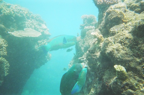 We gingen met een wat kleinere boot zodat je alle ruimte had op het rif. In sommige gevallen kan je echt met z’n honderden op de boot zitten, dan zijn de vissen snel weg! En daar gingen we dan, het was niet zo’n heel heldere dag dus er waren behoorlijk wat golven. Het voelde alsof je op een paard zat die aan het steigeren was, en dat 2 uur lang! Ik had me voorgenomen dat ik geen reispilletje nodig had, want ik had immers nooit last van reisziekte. Maar wie had er met deze hoge golven rekening genomen? Ik denk de rest van de boot. Ik was namelijk de enigste die naar het papieren witte zakje moest reiken. Op een steigerend paard moet je je indenken is niet de makkelijkste opgave. Helemaal niet als je naar de andere kant van de boot wordt gestuurd omdat je niet rustig je gang mag gaan in de bestuurdershut. Na bij wat mensen op schoot gezeten te hebben (lopen gaat niet makkelijk af op zo’n dier:) had ik uiteindelijk de andere kant bereikt en kon iedereen heerlijk meegenieten. Ik zal verder niet in details treden voordat je echt misselijk wordt:) Later kwam er nog een meisje bij me zitten die de vorige dag behoorlijk had gedronken en het ook niet al te best had. Dennis moest vooral naar de horizon blijven kijken en een gids keek ook een beetje zuur. Goed had ik dat ook weer meegemaakt;)