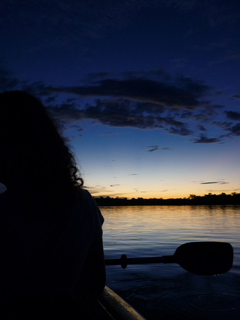 Meer hebben we er helaas niet gezien. Aan het eind van de middag zijn we nog met een kajak de rivier op geweest op zoek naar roze dolfijnen. Die lieten zich op 1 na niet echt zien helaas. Wel zijn we nog met de kajak het bos ingegaan (de helft van het bos staan nu zo´n beetje onder water hier) om een ruzie tussen twee apensoorten boven ons hoofd te zien uitgevochten worden. Het leek zelfs of er 1 te water viel 🙂 Een hoop gekwetter en wat lasergeweerschoten later zat iedereen weer rustig in z´n eigen boom. lang leve de jungle! Op de terugweg nog genoten van een schitterende zonsondergang..