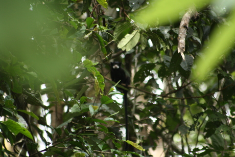 De dag erna voelde ik me al wat beter en hebben we 4 uur door de jungle gelopen met de gids. Ook weer lekker zweten, de zweetdruppels vielen vanaf je nek zo over je rug je onderbroek in, je kan wel raden hoe lekker je ruikt na 2 uur of zelfs na 4 uur. We moesten in ieder geval wel 2 meter afstand van elkaar houden. :). De geluiden maakten een hoop goed, ik heb ze helaas niet opgenomen, maar wat zijn het er veel, van een heel hard plons geluid dat je alleen in tekenfilms hoort (ik denk een kikker) tot een geluid van een lasergeweer wat uiteindelijk een heel lief klein onschuldig aapje is. Uiteindelijk na drie uur wandelen een hoop gerommel in de boom: apen ! Drie kleine zwart witte aapjes keken ons van een meter of 30 afstand nieuwsgierig aan.