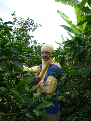 Hierna gingen we zelf koffie plukken zodat we konden meemaken wat alle koffieplukkers iedere dag, dag in dag uit moeten doen. Eerst moesten we een pak aan, Ramona 1 voor de winter, een van koffiebonenzakken gemaakte broek met 2 gaten zodat je niet de hele tijd je pak uit moest doen als je naar de wc toe moet, en voor Dennis een pak voor de zomer, met bescherming voor de zon. Er moest natuurlijk ook nog een radio mee en een emmer werd voor je buik gebonden zodat je daar alle koffiebonen in kon stoppen. Dit was natuurlijk hilarisch, we zagen er niet uit en het schoot maar niet op, echt respect voor de koffieplukkers!